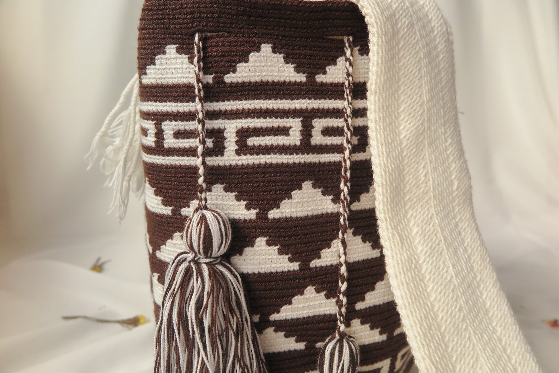 El cuerpo del bolso se elabora en uno o más colores, utilizando la técnica de doble hilo que garantiza un tejido compacto, resistente y de gran calidad. Cada pieza presenta un patrón decorativo o incorpora diseños tradicionales Kaanas, reflejando la identidad cultural y el arte ancestral del tejido Wayuu.