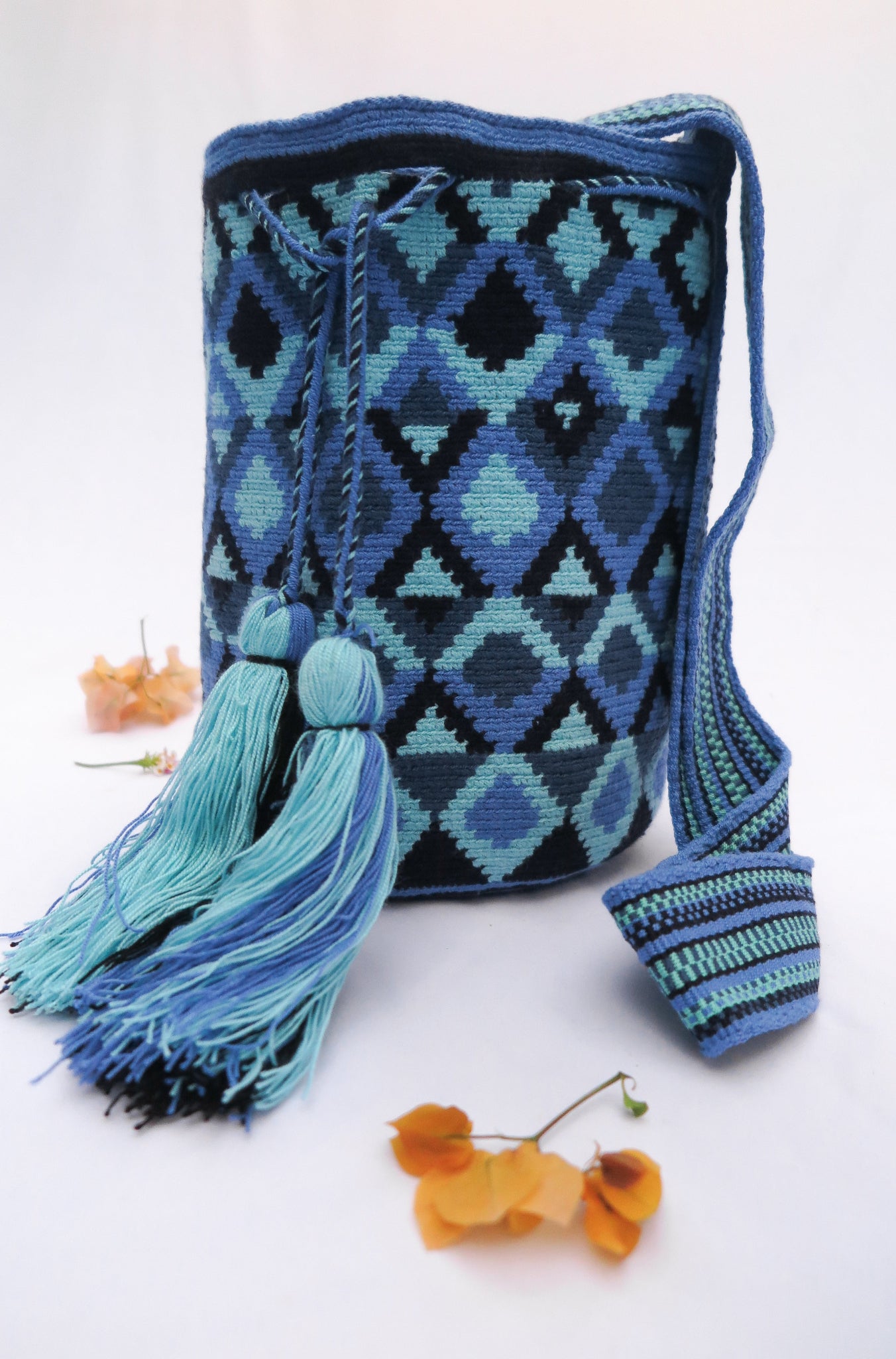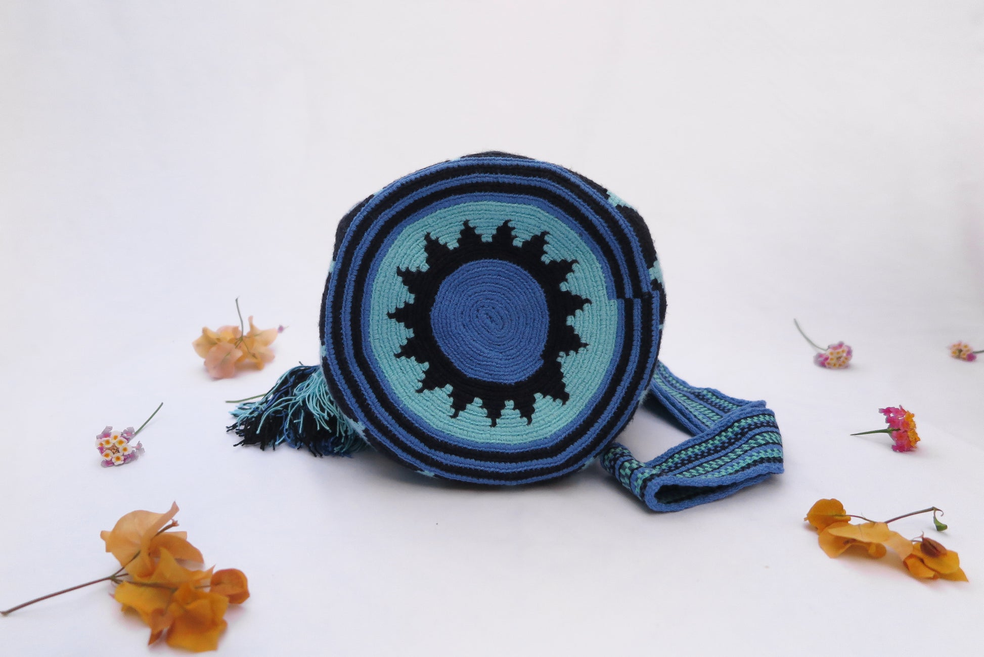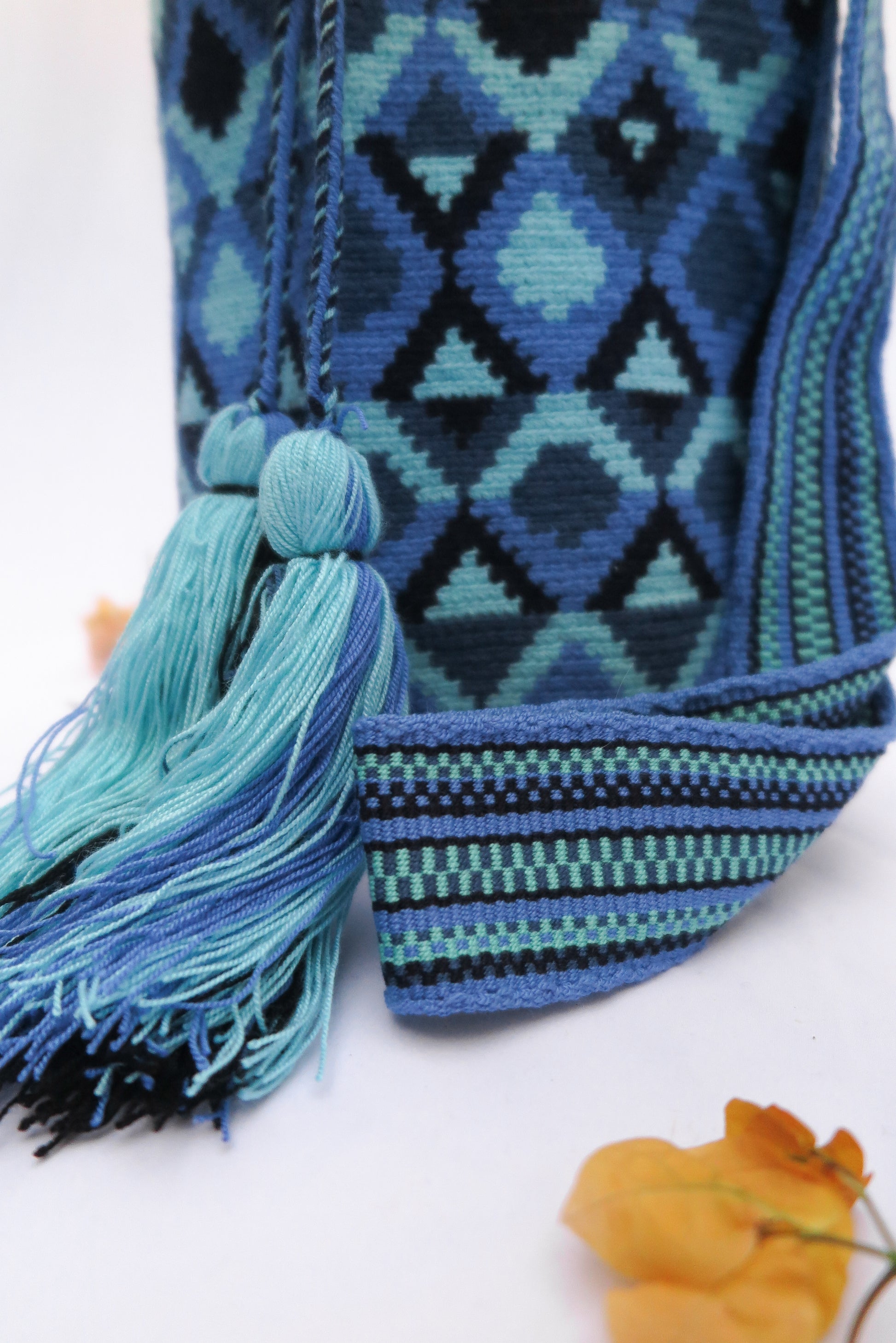 Con una elegante combinación de azul oscuro, negro, azul cielo y azul turquesa, la mochila presenta un patrón geométrico tradicional que refleja la riqueza cultural Wayuu. Los tonos profundos de azul oscuro y negro aportan fuerza y sofisticación, mientras que el azul cielo y turquesa iluminan el diseño con frescura y vitalidad. La gasa está totalmente adherida al cuerpo de la mochila, lo que aporta mayor resistencia y firmeza, ideal para quienes buscan funcionalidad sin perder el estilo auténtico de una pieza hecha a mano.