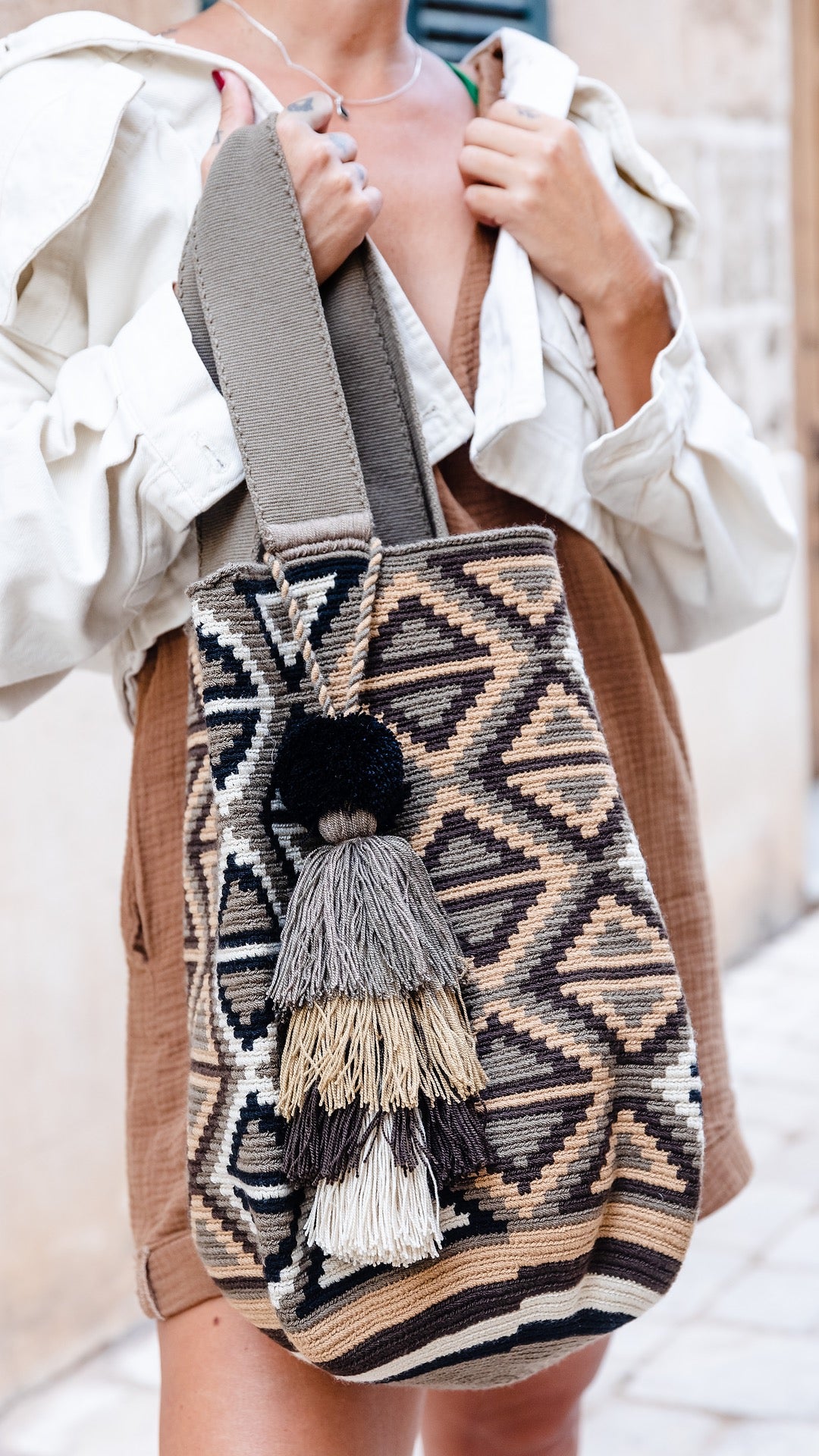 Con un elegante patrón geométrico en tonos blanco, marrón arena y marrón oscuro, esta bolsa es ideal para quienes buscan algo más que un accesorio de moda: una pieza que cuenta una historia. El diseño atemporal y la calidad de los materiales la convierten en la opción perfecta para tu día a día o para ocasiones especiales.